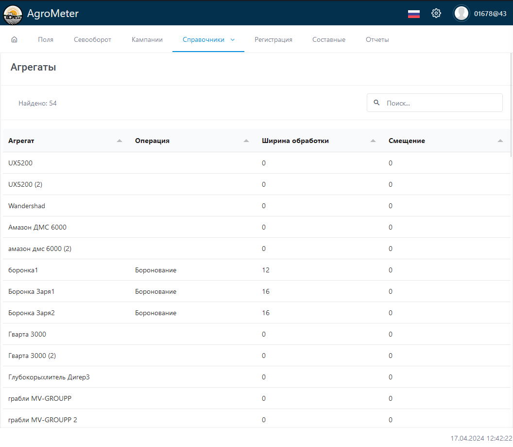 - ширину захвата (в метрах), на основании которой впоследствии рассчитывается обработанная площадь поля;