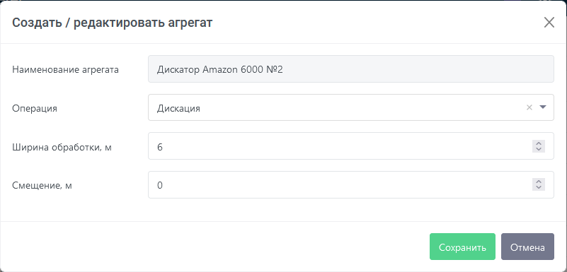 Создание, редактирование и удаление агрегатов (прицепов) доступно только в Система мониторинга. Из Система мониторинга также приходит информация о назначении агрегатов на объекты.