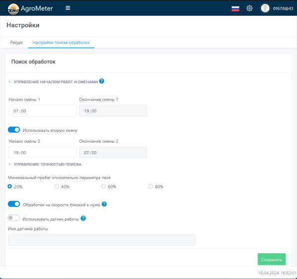 | Обработки на скорости, близкой к нулю | Опция, после включения которой система должна искать обработки, даже если объект двигался в пределах поля менее 5 мин. При этом при расчете длительности обработки учитываются также интервалы с нулевой скоростью, то есть включается все время с начала обработки до ее конца. |